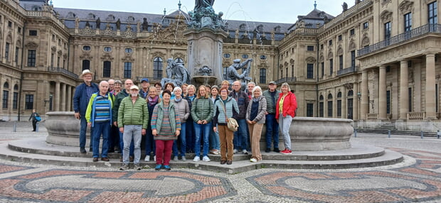 Zum Abschluss des 50-jährigen Jubiläumsjahres fand am Sonntag, 12. Oktober unsere Stadtfahrt nach Würzburg statt. 27 Teilnehmer trafen sich morgens am Parkplatz beim Sportplatz, um gut gelaunt die Busfahrt anzutreten. Nach knapp zwei Stunden Fahrt, während der sich alle mit einer frischen Brezel und einem Gläschen Sekt oder O-Saft stärkten, erreichten wir den Vorplatz der Residenz. Dort wurden wir von zwei Stadtführerinnen empfangen. Eine größere Gruppe besichtigte die Residenz und einen Teil des Hofgartens, während die anderen durch den kompletten Hofgarten geführt wurden. Beide Führungen waren sehr kurzweilig und informativ. Wir bekamen einen guten Eindruck über das Leben und die politischen Verhältnisse in der Stadt. Insbesondere zu den Regierungen der Fürstbischöfe. Nach einer kurzen Pause gab es dann eine Stadtbesichtigung zu Fuß oder mit dem Bähnle. Hierbei wurde noch mal auf die massive Zerstörung im 2. Weltkrieg und den Wiederaufbau eingegangen. Auffällig sind auch die vielen Kirchen in der Innenstadt. Nach vielen interessanten Eindrücken und Informationen über die Stadt Würzburg trafen sich alle zum Essen im „Alten Kranen“. Gut gestärkt flanierten wir zur Alten Mainbrücke, um dort bei einem Brückenschoppen noch mal den Blick über die Stadtkulisse, zur Festung Marienberg, zur Wallfahrtskirche Käppele und zu den Weinbergen oberhalb des Mains schweifen zu lassen. Auf der Heimfahrt waren sich alle einig, dass sich ein weiterer Besuch in Würzburg lohnt.