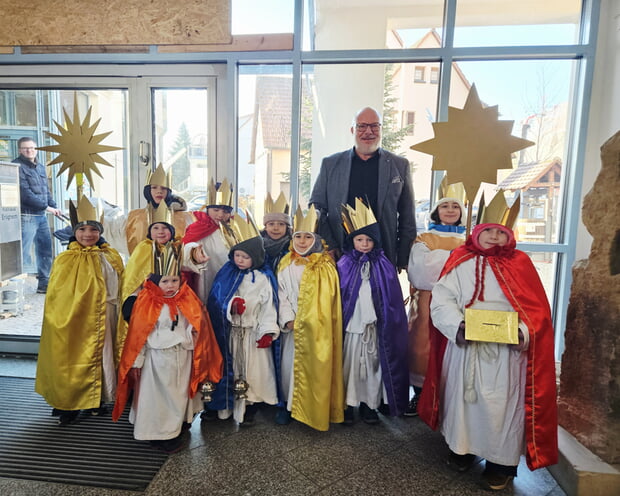 Am ersten Arbeitstag im neuen Jahr hat das Rathaus einen Besuch der Sternsinger bekommen, Bürgermeister Schäuffele nahm den Segen für das Jahr 2026 entgegen und dankte für den Besuch mit einer Spende und einer Tüte voller Süßigkeiten. Das Motto der Sternsingeraktion 2026 lautet „Schule statt Fabrik – Sternsingen gegen Kinderarbeit“, womit der Fokus auf der Kinderarbeit und der Bedeutung von Bildung liegt, besonders für Kinder in Bangladesch. Die Aktion macht darauf aufmerksam, dass Kinder arbeiten müssen, anstatt zur Schule gehen zu können, und sammelt Spenden, um ihnen neue Perspektiven zu eröffnen. Die Sternsinger schreiben C+M+B und die Jahreszahl an die Tür, was für „Christus Mansionem Benedicat“ (Christus segne dieses Haus) steht, aber auch als Initialen für Caspar, Melchior und Balthasar interpretiert wird. Diese Zeichen sind ein Segen für das Haus und symbolisieren den Besuch der Heiligen Drei Könige.