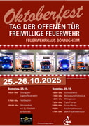 Die Feuerwehr Bönnigheim lädt alle Bürger/innen und Interessierte zum Tag der offenen Tür mit Oktoberfest am 25. und 26. Oktober ein. Ein abwechslungsreiches Programm wird geboten und für das leibliche Wohl ist ebenfalls gesorgt.