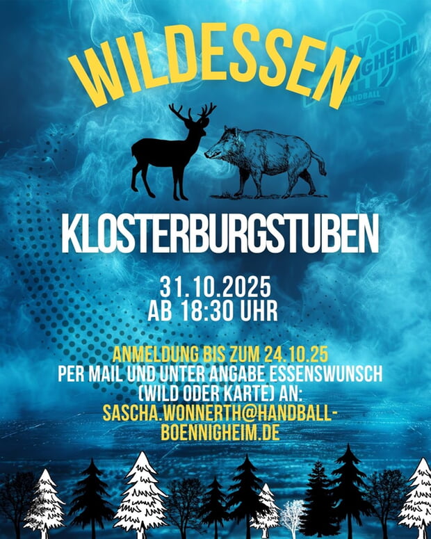 Die Handball-Abteilung lädt alle Mitglieder und Freund*innen der Abteilung am Freitag, 31. Oktober 2025, ab 18.30 Uhr recht herzlich in die „Klosterburgstuben“ in Bönnigheim ein, zum traditionellen Wildessen. Für die, die kein Wild mögen gibt es die Möglichkeit aus einer kleinen Karte andere leckere Gerichte zu wählen. Die Handball-Abteilung freut sich auf einen gemütlichen Abend bei leckerem Essen. Um Anmeldung unter Angabe des Essenswunschs (Wild oder Auswahl) wird bis zum 24. Oktober 2025 gebeten: per Mail ansascha.wonnerth@handball-boennigheim.de oder telefonisch bei Christof Weis, Tel. 0151/14748276.