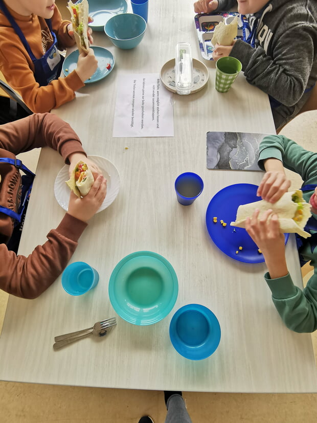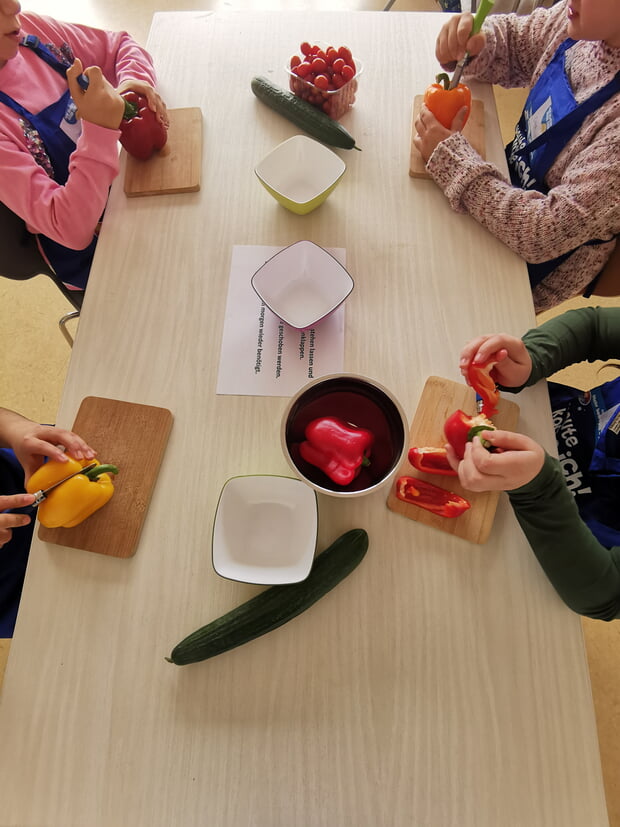 Nach der Sporteinheit ging es ans Mittagessen vorbereiten. In kleinen Gruppen schnitten und rührten wir alles, was wir für unsere Gemüse Wraps brauchten. Mit leckerem Gemüse und Quark belegten wir unsere Wraps. Anschließend gab es sogar einen Obstquark, diesen hatten wir natürlich auch selbst gemacht.
