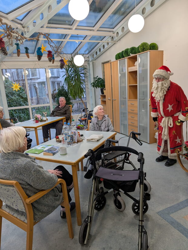 Die Bewohner saßen gerade noch bei Kaffee und Kuchen als tatsächlich der Nikolaus unter lautem Gebimmel mit einem fahrbaren Schlitten im Schlepptau in den Saal kam. Ach, wie war die Freude groß, leuchtende Augen waren zu sehen und ein Lachen hier und da zu hören. Er verteilte die liebevoll gepackten Päckchen vom Förderverein und hatte für jeden Bewohner ein gutes Wort. Er schaute dabei nur in glückliche Gesichter. Später ging er dann noch ins Kleeblatt-Wohnen, um weiter Nikoläuse vom Haus zu verteilen. Auch da war die Freude groß.