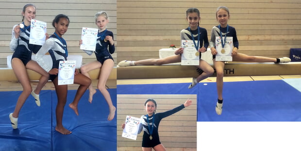 Annika (8), unsere jüngste Teilnehmerin, turnte zum ersten Mal bei Gaumeisterschaften und am Balken mit faszinierender Sicherheit. Sie erhielt dort eine der besten Wertungen. Ebenfalls zum ersten Mal dabei waren Alina (12) und Lea (10). Beide zeigten sehr schöne Übungen und Lea an ihrem letzten Gerät, dem Reck, sogar eine bilderbuchmäßige P5 mit nur 1,1 Punkten Fehlerabzug. Idas Premiere an diesem Wettkampf war ihre P6 am Boden, die bis auf ein Element passabel gelang, sodass wir über die 5 Punkte Fehlerabzug überrascht waren. Jaelyn (11) und Emma (12) zeigten an den Geräten ihre hervorragende turnerische Entwicklung im vergangenen Jahr und rutschten beide in der Siegerliste um 20 Ränge nach oben im Vergleich zu 2025.
