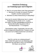 Wir bieten ein wöchentliches Treffen für alle Mütter oder Väter mit Kindern von 0 bis 4 Jahren an. Wir bitten vorab um kurze Kontaktaufnahme bei Anja (0176/24250661) gerne per WhatsApp.