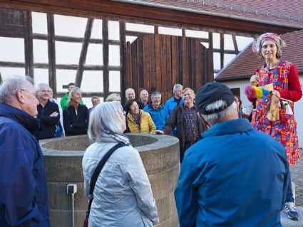Stadtführerin Meike Junginger in der Rolle als Angelica Brentano, präsentiert die Geschichten der großen Frauen aus Bönnigheim, die sich durch die Jahrhunderte der Stadtgeschichte ziehen. Nicht gerade leicht macht es ihr, der aus dem 14. Jahrhundert stammende Ganerbe und Baumeister Friedrich von Sachsenheim. Dieser hat es sich zur Aufgabe gemacht, in der Stadt für Ruhe und Ordnung zu sorgen.